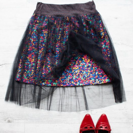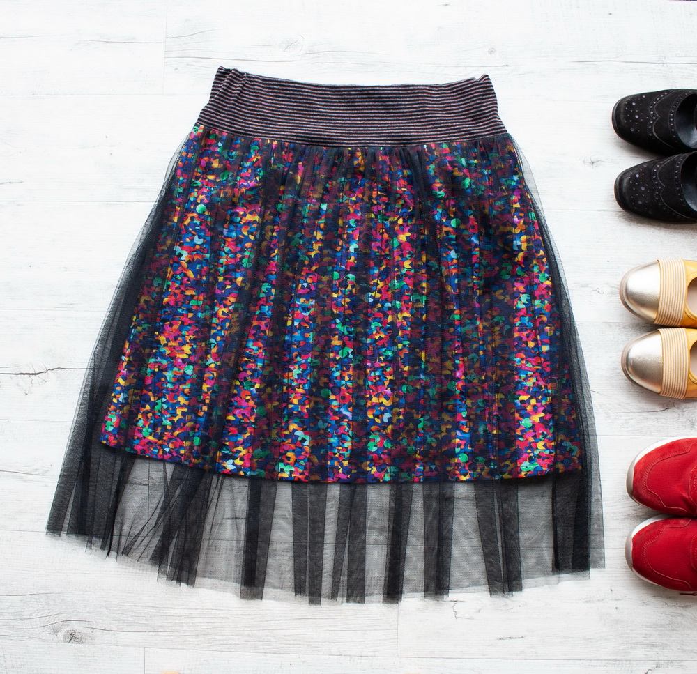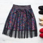 Střih do „A“ kopíruje boky, nepřidává tak na objemu, zatímco lehounký splývavý tyl se navrch vlní kolem vašich boků. V pružném pase je všita jemná guma, díky ní pas hezky přilne, nebude se vytahovat.