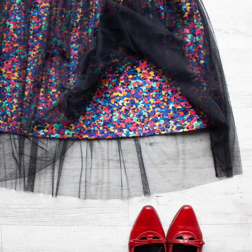 Spodní sukně z prémiové bavlněné látky – příjemné bavlněné plátno z vlastních Happy Helen vzorů pod závojem z černého tylu.