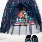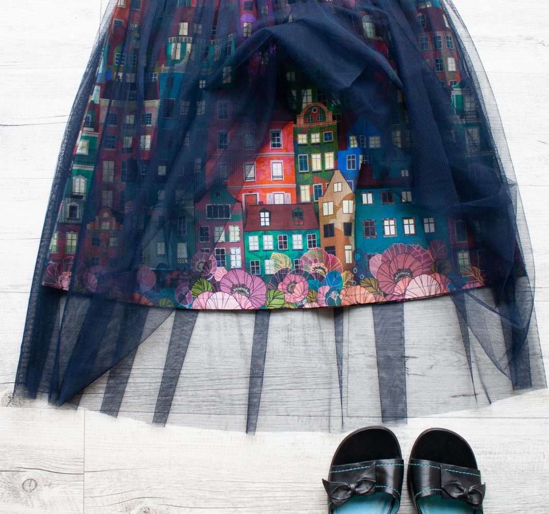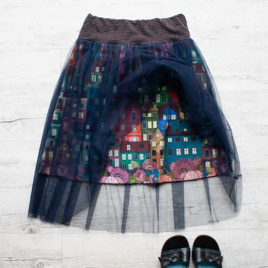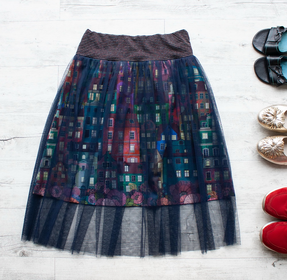 Střih do „A“ kopíruje boky, nepřidává tak na objemu, zatímco lehounký splývavý tyl se navrch vlní kolem vašich boků. V pružném pase je všita jemná guma, díky ní pas hezky přilne, nebude se vytahovat.