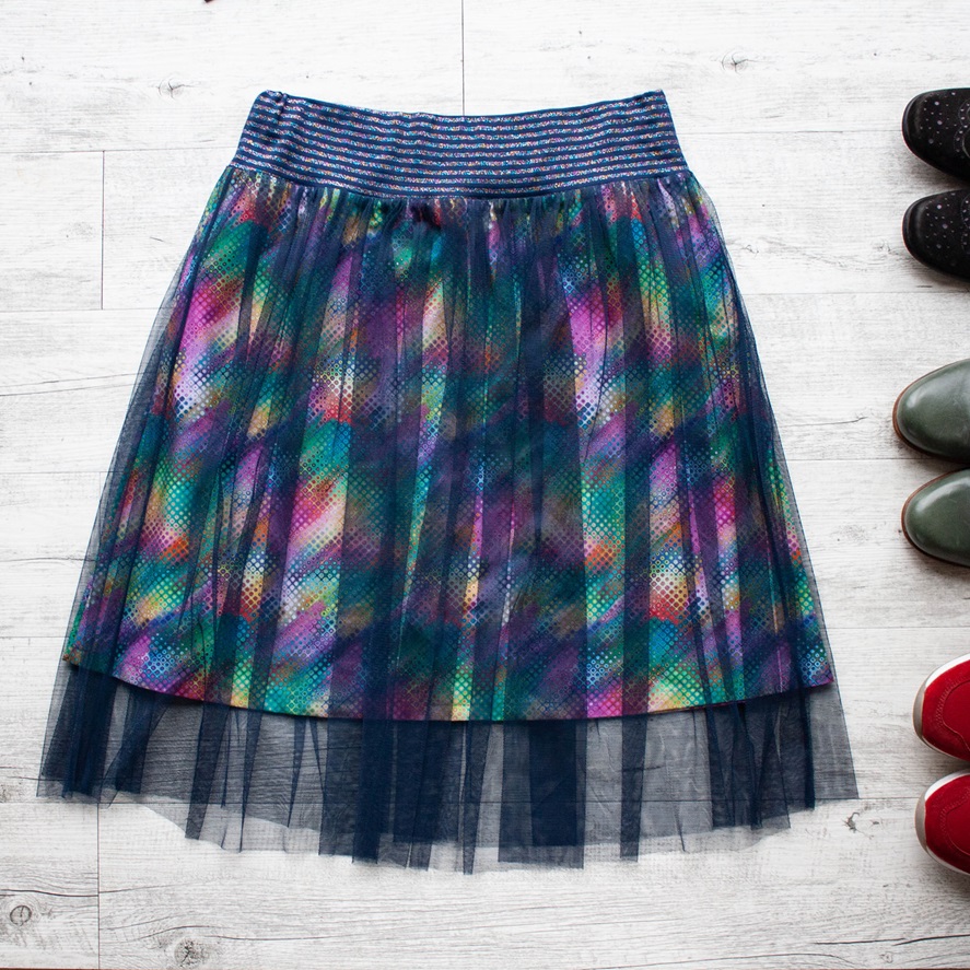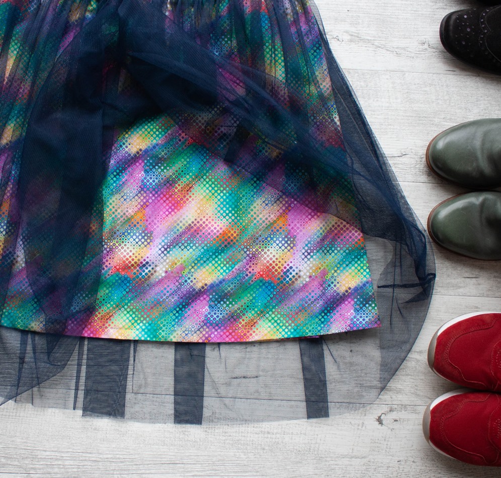 Spodní sukně z prémiové bavlněné látky – příjemné bavlněné plátno v duhovém vybarvení, pod závojem z tmavě modrého tylu. Střih do „A“ kopíruje boky, nepřidává tak na objemu, zatímco lehounký splývavý tyl se navrch vlní kolem vašich boků. V pružném pase je všita jemná guma, díky ní pas hezky přilne, nebude se vytahovat.