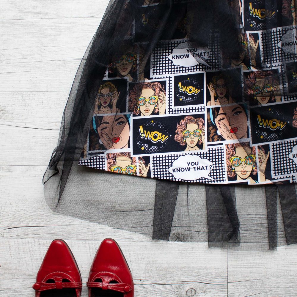 Sukni můžete nosit v pase nebo jako bokovou. Spodní sukně je z bavlněné teplákoviny s elastanem a mírně pruží, pro zachování lehkosti modelu si ale pořizujte velikost tak, aby sukně nebyla vypasovaná.